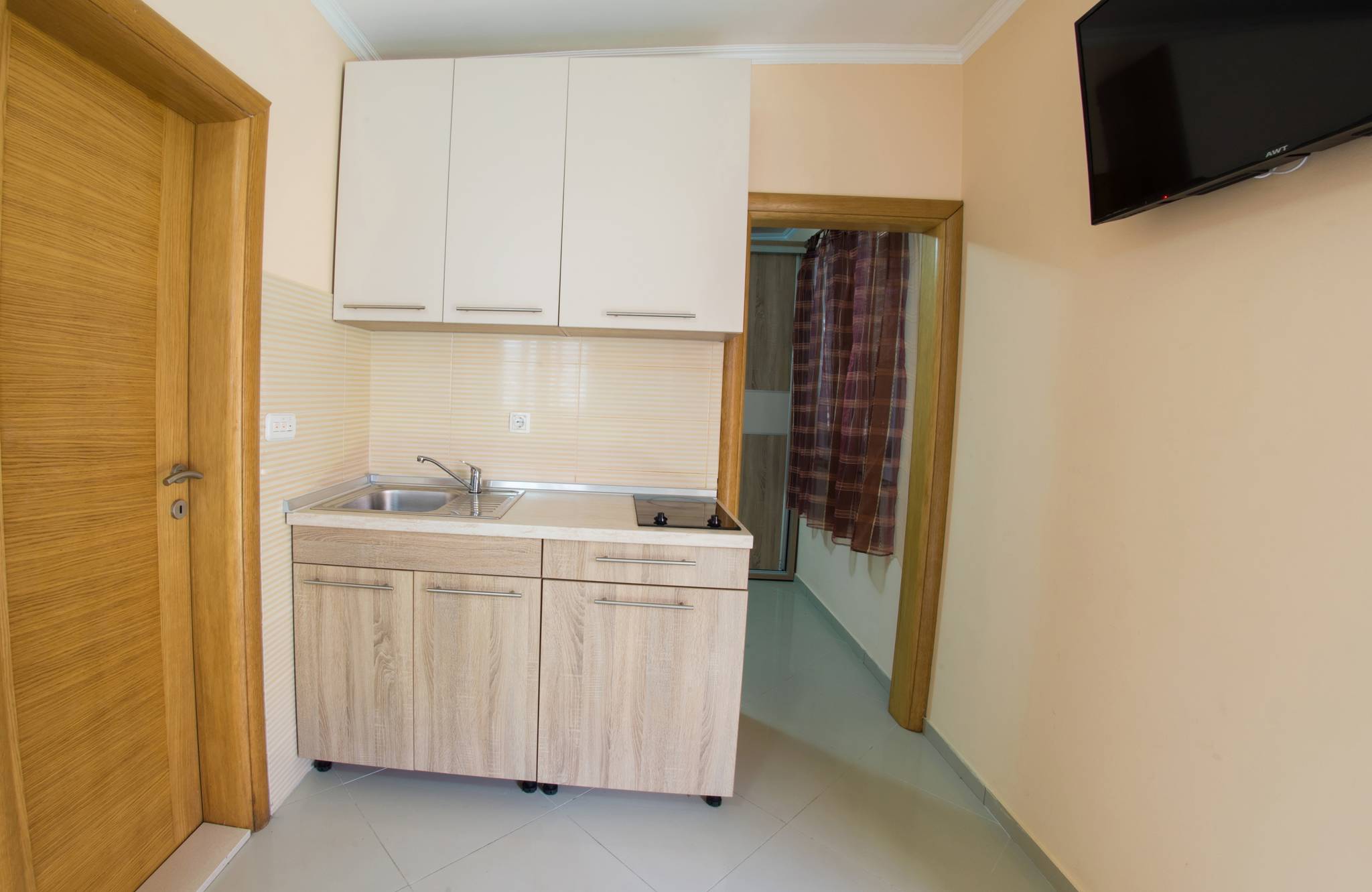 Studio geeignet für bis zu 3 Personen. Es ist mit einem Doppelbett in einem kleineren separaten Raum ausgestattet und im kleineren Wohnzimmer gibt es ein Schlafsofa, auf dem ein Erwachsener oder möglicherweise zwei Kinder schlafen können.