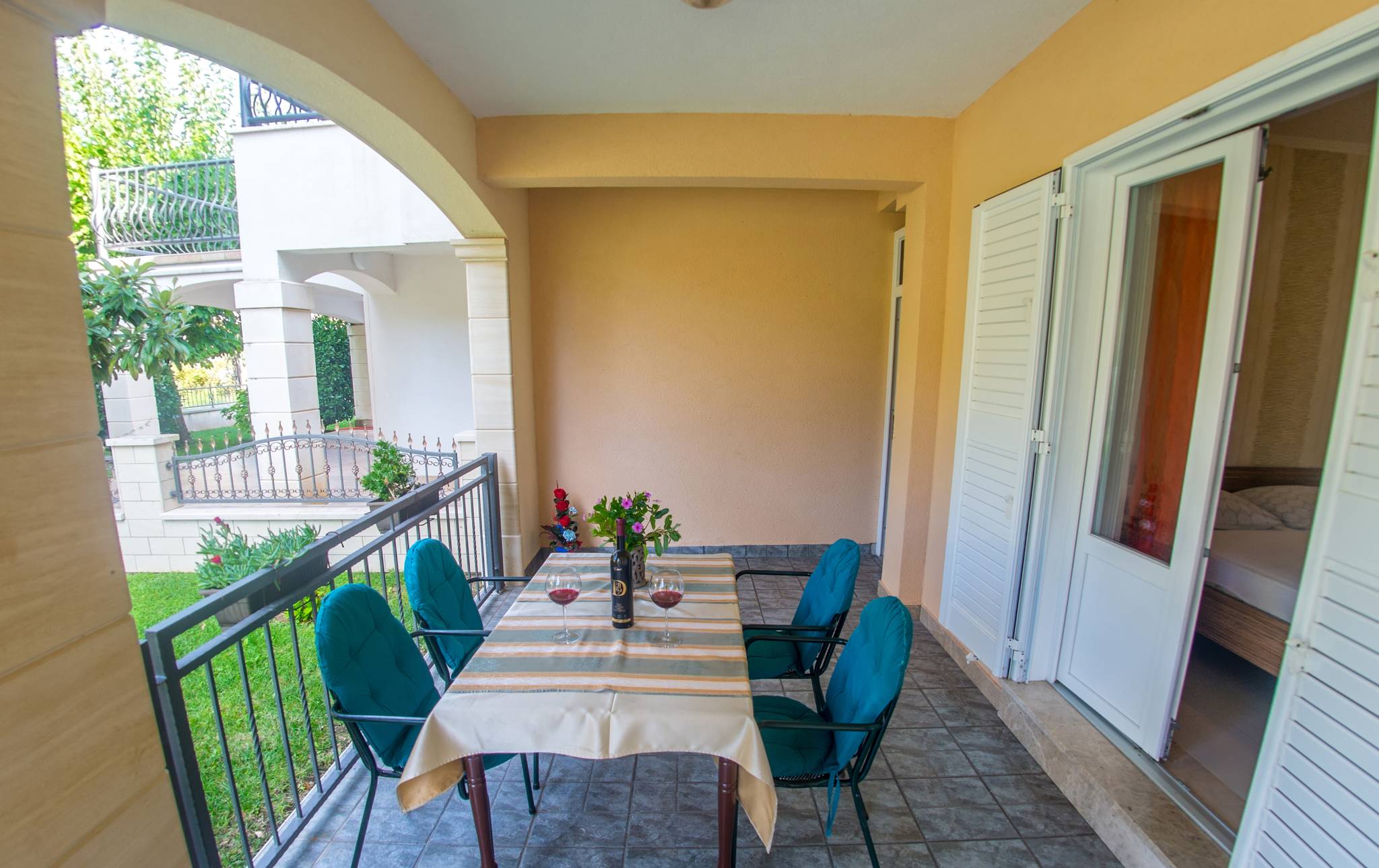 Apartment mit 2 Schlafzimmern für 5 Personen. Ein Zimmer ist mit einem Doppelbett, einem Sessel als Zustellbett, einem separaten Badezimmer mit Dusche und einer Toilette ausgestattet. WLAN ist im Apartment verfügbar, ebenso wie TV und Klimaanlage. Das zweite Zimmer ist mit einem Doppelbett, TV, Klimaanlage und einem eigenen separaten Badezimmer mit Dusche und WC ausgestattet. Die Wohnung verfügt über eine Küche mit direktem Zugang von der Terrasse. Die Terrasse liegt unter der Arkade und bietet einen Blick auf den Park, in dem zwei 40 Jahre alte Palmen stehen. Die Spielhalle ist mit Gartenmöbeln aus Metall ausgestattet. Zur Wohnung gehört ein gesicherter Parkplatz.